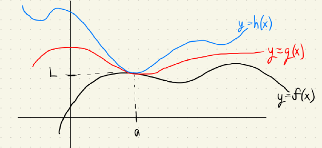 Here’s an illustration of the red function $g(x)$ being squeezed between the upper blue function $h(x)$ and the black function $f(x)$ from below at the point $x=a$.