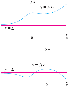 Analogously, if the function is defined on $(-\infty, a)$, then we can have $\displaystyle \lim_{x\to -\infty} f(x) =L$ if $f(x)$ gets arbitrarily close to $L$ as $x$ get sufficiently large in the negative direction.