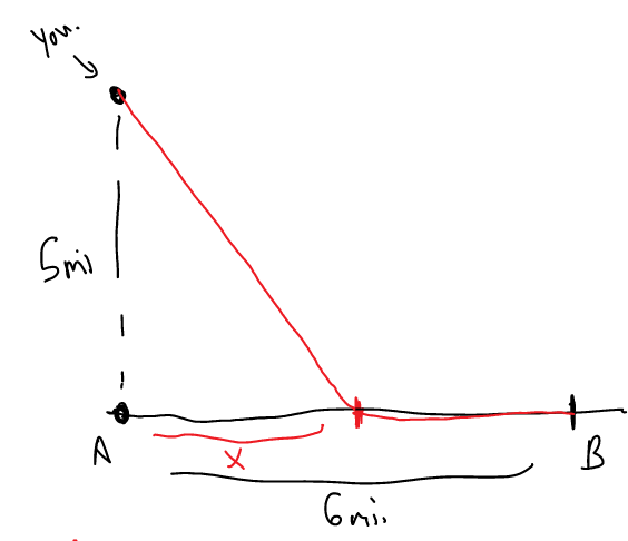 You are sitting in a row boat (in perfectly still water), 5 miles from a perfectly straight shoreline. You want to be at point B. If you can row 2mph and walk 4mph, at what point to the right of A should you land your boat in order to minimize the amount of time traveled?